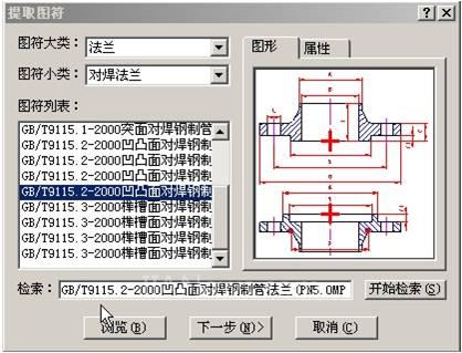 (3) 在图符大类中选择法兰,在图符小类中选择整体法兰,在图符列表中选择GB/T9115.2-2000凹凸面对焊钢制管法兰(PN5.0MPa),右图所示为法兰图形显示。进入“下一步”在图符预处理中选取公称通径DN为100mm,按“确定”即可。并用同样方法选取相应尺寸规格的螺栓、螺母和垫圈等,如图11所示。