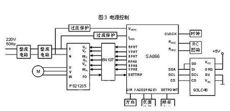 220V交流电经过整流滤波得到的直流电压作为PS21255的逆变直流电压输入,SA866产生三相互差120。的3对SPWM信号,通过光电隔离作用于PS21255控制输入端,在PS21255的输出端输出三相互差120。的SPWM波来驱动异步电机。通过改变输出频率,实现异步电机变频调速。PS21255具有过热、过(欠)压、过流和过热检测及保护电路。当任何一种故障发生时,它将封锁内部6只IGBT管,同时送出故障信号FO。