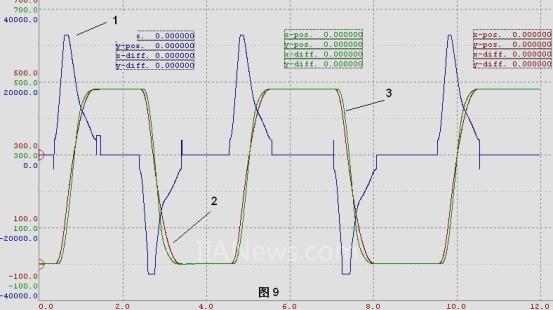 通过修改以上参数可以得到模架运动的profile曲线,见图9的曲线2,依据速度(V)推算比例阀的流量(Q),再由流量依据比例阀的流量曲线可以获得控制电压的值(U)。实际获得的运动轨迹见图9的曲线3。图9的曲线1是比例阀上的控制电压,从图中可以看出,实际的误差是非常小,曲线的轨迹也非常平滑。
