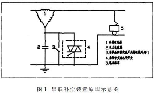 串联补偿装置的工作原理是在电铁供电线路负荷较重、线路感抗损耗严重时通过投入事先串联在回路中的电容器, 改变电路负载类型, 从而达到提升网压和改善功率因数的作用。如图1 所示。由于电铁负荷是一个运动负荷, 负荷的大小不仅与机车的数量有关, 而且还与机车的载重、机车的运行状态、线路的坡度等因素密切相关。电容器的投切操作也相当频繁。如果使用机械( 有触点) 开关, 由于其投切时刻相对于网压相位的随即性, 触头在非过零点吸合时会因短路电力电容器而受到很大的电流冲击, 其电气寿命通常只有几十次。因此在串联补偿装置中必须采用晶闸管交流电子开关来实现对电力电容器的过零投切。