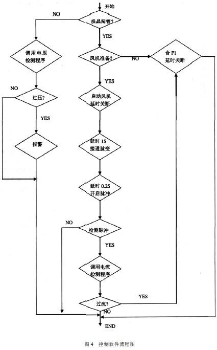 逻辑控制软件包含了晶闸管电子开关的所有控制逻辑, 在软件结构上由1 个主程序、2 个子程序、2 个定时中断程序构成。它的主要功能是: 根据控制要求, 实现对电压、电流的检测,适时的发出触发信号, 以及对过压、过流、风机、电源等诸类故障的检测, 并及时发出报警信号, 实现保护功能。该软件实现的流程图如图4 所示。