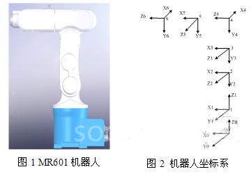 深圳市众为兴数控技术有限公司自主研发设计的MR601机器人,是一款集工业教学应用于一体的MIN I型6自由度机器人,如图1所示,对应连杆坐标系见图2。
