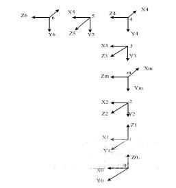 其中:Z0为基座原点,坐标系X2Y2Z2为机器人第2关节坐标系,坐标系XmYmZm为增加的机器人虚拟关节坐标系,轴线Zm垂直于关节2轴线Z2。