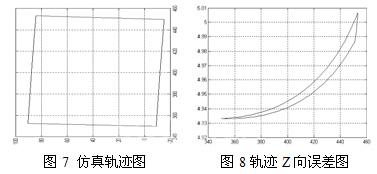 由图7的仿真图与图5的实际轨迹图对比可知,两者的轨迹走向基本一致;从图8的Z向误差图可以得知,机械间隙导致Z向有近0.1mm的变化。