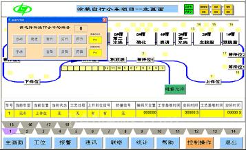 ii.主柜安装了一台HMI, 选用菲尼克斯公司TP 12T触摸屏,对18台小车进行的启动、停止、吊具的升降及各工序工艺时间的控制和操作;实时显示整线运行情况,在线显示车组状态、位置、所载工件类别、当前工艺节拍状态等信息,并能进行故障诊断和报警。