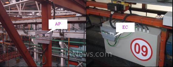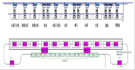 ii.设置无线接入点(简称AP)2台,经测试实际用1个AP就可以满足系统通讯需求,最终采用了两个AP的方案一方面是考虑到其中任一台AP出现故障,另一个AP仍然可以确保网络正常运行,起到热备的作用,提高了系统的可靠性;另一方面采用两个AP可以实现EC漫游通讯,两个AP都正常时,不管小车运行到哪个位置EC都能保持与AP的通讯距离,保证获得非常好通讯质量。AP和EC设置如下图