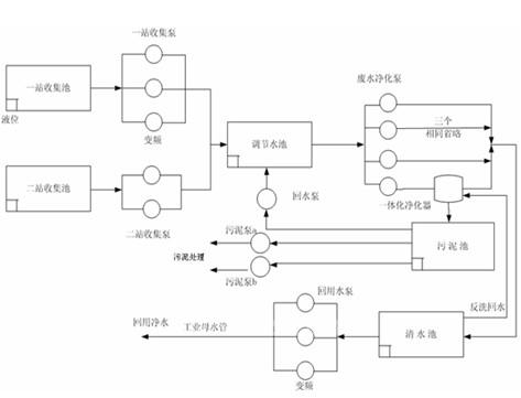 本次项目的主要任务包括含煤废水的回放、化学再生废水收集、主厂房内系统优化消防、生活水系统隔离、生活污水及工业废水回用工程。采用一定的污水处理工艺,并通过自动化控制达到预期规定的控制指标。整个废水处理系统由收集池、调节水池、净化器、污泥池、清水池等部分组成,在废水处理过程中,我们将系统划分为五个子系统来处理,分别为:净水系统、储药系统、过渡调节系统、清水回用系统以及污泥浓缩系统。