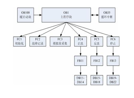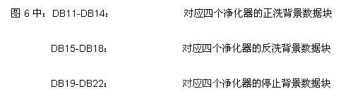 由废水处理的工艺流程可以知道,废水在经过一系列的水池后最终进入四个废水净化器,在净化器里经过工艺的处理后排放到清水池中。从程序角度看,四个废水净化器的控制流程一致,因此没有必要为每个净化器编写一段代码,只需编写一个函数块,让它们都调用即可。为此,对于在净化器中的正洗、反洗和停止流程都编写了一个程序块,分别是FB11,FB12,FB13。对于每个净化器来说只要分别调用相同的函数块就行,对于每个净化器中不同状态的数据是利用其不同的数据块来加以区别的。这样在整个程序中即保持了流程的统一性,即减少了程序代码,节约了存储空间,又方便维护和修改。
