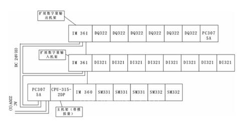 电厂污水处理控制系统的输入输出信号主要分成4个部分,分别为模拟量输入、输出,数字量输入、输出,并放在三个相连的导轨上,如图7所示: