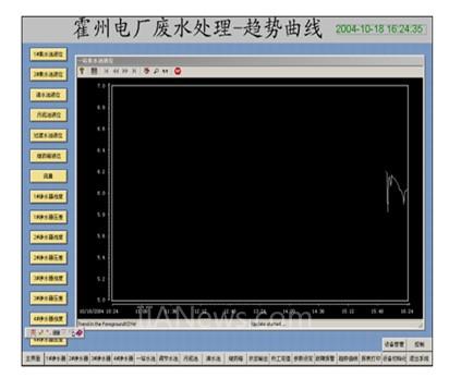 系统可对废水处理装置的各项仪表数据实时的在线监视,并且生动直观的反应在监控界面上面。系统的刷新数据是1秒,历史的保存间隔是2分钟。图12为废水处理系统工艺监控界面。