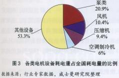 电机作为各种工业设备的主要部件,其下游产业主要是风机、泵类、压缩机、空调制冷机、机床、起重运输机械、建筑机械、食品机械、农业机械、冶金机械、化工机械、轻工机械、林业机械、印刷设备、造纸设备、纺织印染设备、灌装设备、传送设备、包装设备等各种工业机械设备的生产企业。其中风机、泵类、压缩机和空调制冷机对电机产品的需求量最大,其耗电量分别占全国总耗电量的10.4%、20.9%、9.4%和6%(图3)。
