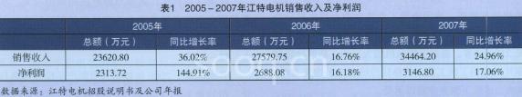 与普通标准电机相比,特种专用电机生产企业日子要好过一些,以生产起重冶金电机、电梯电机、高压电机为主的江西特种电机股份有限公司是经济发展和工程建设的直接受益者,业绩连年保挣陕速增长,2005年到2007年净利润率分别是9.8%、9.7%和9.1%,明显高于行业平均水平(表1)。