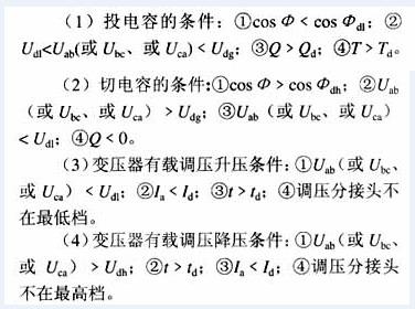 上述条件中,cosΦ为功率因数实时值,cosΦdl为功率因数下限定值,cosΦdh为功率因数上限定值,Udl为低电压保护定值,Uab(或Ubc、或Uca)为母线电压,Udg为高电压保护定值,Q为无功功率实时值,Qd为无功需求量定值,T为投入电容间隔时间,Td为电容间隔时间定值,Ia为 10kV侧总电流,Id为过载闭锁调压电流定值,t为调压延迟时间,td为调压延迟时间定值,Udh为调压上限定值。