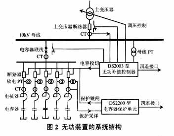 新型电压无功综合控制装置包括:高压真空专用断路器、避雷器、放电用高压PT、串联电抗器、高压电容器、控制器、电容器组微机保护单元、柜体及辅助连线,并可提供RS485通讯接口。系统结构见图2。