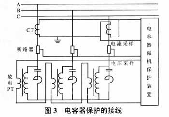 新式保护单元为专门用于无功补偿装置的电容器保护,该保护有两种:三段式过电流保护、零序电压保护。这种保护不仅能够完全取代传统的电容器保护,而且具有原理先进、针对性强、可靠性高的优点。该保护的接线见图3。