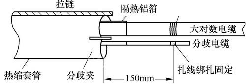 12.分歧电缆一端,距热缩套管150毫米处应用扎线永久绑扎固定后,方可 进行加温烘烤热缩套管
