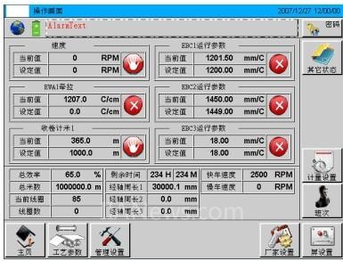 工程师经过讨论,将整个屏设计为三个部分,最上面的日常状态显示,它可以显示客户公司的LOGO、批号、时间和画面的页面名称,在中间部分显示状态页、参数设置页内容,底部区域设计为页面切换的键,采用了Windows风格的操作图标。