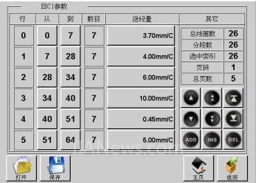 我们从下图可以看到EBC参数设置画面,对于普通的系统而言,本来最多需要33幅画面(每个循环周期横列总数最多可以设定64,如果细分为64段,每页显示6段,一组EBC参数需要11页)才能完成的三组EBC参数设定,而对于B&R的PCC,这里只用了一幅画面来实现,完全归功于程序的编写技巧,体现了贝加莱软件强大编程功能,不仅节省了程序存储空间,也提高了运行效率,使得程序更加便于维护。