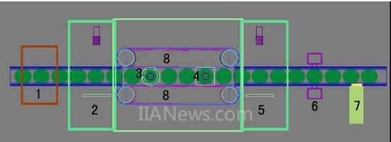 通过特殊设计的LED光源打光,CCD相机拍照,将拍取的照片信息送到图像处理器系统,图像处理器对照片进行处理分析,判定拍取的照片是否合格,并将合格信号送出给控制系统。