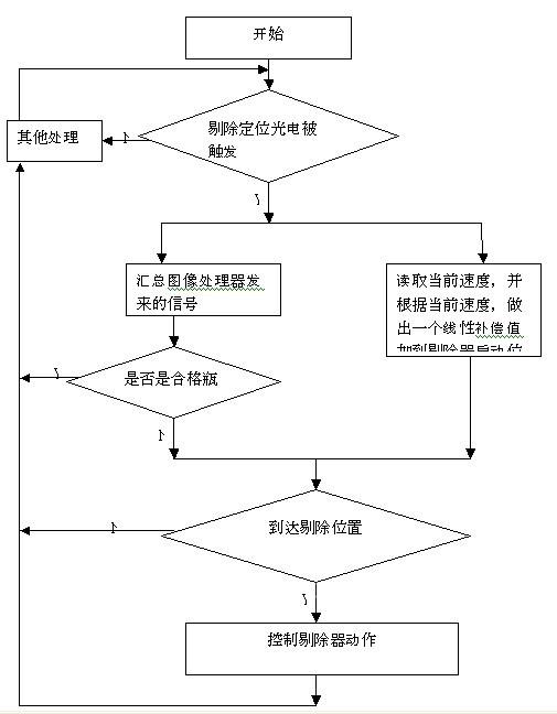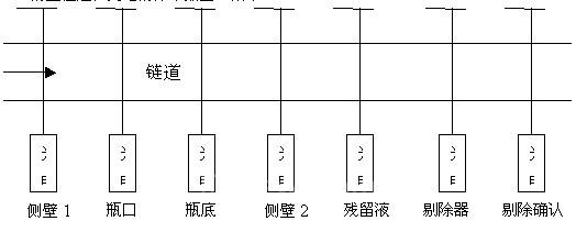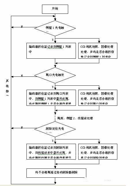 瓶子在链道上运行首先触发前侧壁光电,用一个结构体数组A 记录其当前的编码器的值,和前壁检测的好坏信息。瓶口光电触发记录当前的编码器的值,然后将当前的编码器的值减去瓶口光电到前壁光电之间的脉冲距离REMOVE1,然后在一个容差范围△内(即REMOVE1±△范围内)查找前侧壁结构体数组里编码器的值,找到此瓶的记录前侧壁检测的好坏信息,拷贝到瓶口的结构体数组中,并记录下瓶口检测的好坏信息。如果在前侧壁结构体数组中找不到此瓶则认为此瓶是多出的瓶子,可能是滑动过大或者是人为插入的瓶子,将此瓶记录为不合格瓶。同理瓶底光电触发去查瓶口的结构体数组,后壁光电触发去查瓶底的结构体数组,剔除光电触发则去查后壁结构体数组。到了剔除光电的结构体数组则汇集了当前光电触发编码器值及前壁、瓶口、瓶底、后壁检测的所有信息。通过监控当前的编码器值和剔除结构体数组的信息来决定是否让剔除器动作来将瓶子剔除。