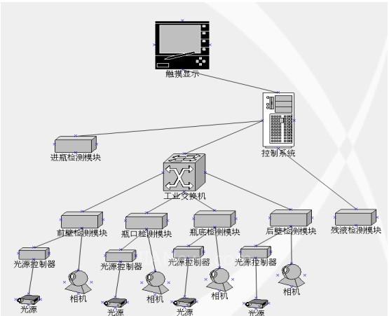 验瓶机要实现的功能是对啤酒瓶进行全方位的检测,将检测的结果信号送给控制系统,控制系统对接收到的信号进行分析汇总,控制单段式或多段式剔除器将不合格的瓶子剔除。检测系统分六大检测模块:进瓶检测模块、侧壁检测模块1、瓶口检测模块、瓶底检测模块、侧壁检测模块2、残留液检测模块。如图1所示: