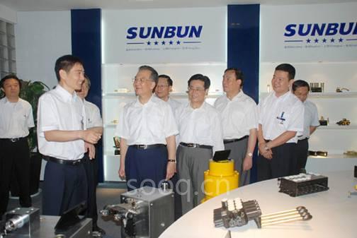 走进生产车间,显示屏上“产业报国,把世界技术引进中国,让中国技术引领世界”的大字吸引了温总理一行。在圣邦新研发的大流量电液比例伺服阀测试系统面前,听到了圣邦公司技术顾问浙江大学孔教授对该产品的介绍:“这是圣邦公司和浙江大学联合研制的,主要用于压铸机、注塑机电液比例调速,可以实现程序控制,提高生产效率,是填补国内空白、替代进口的产品,现该项产品正在测试阶段。”温总理表示了肯定和支持,高兴地说:“预祝你们成功。”温总理一行在圣邦公司车间足足考察了二十多分钟。