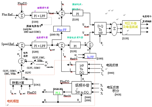 该高压变频器采用的是矢量控制模型,目前高压变频器大多使用矢量控制方式来控制感应电机及同步电机。图1-1给出了一种高压变频器的矢量控制算法简图。它由以下几个基本模块组成:马达模型、电流调节器、磁通与速度调节器及前馈补偿环节。