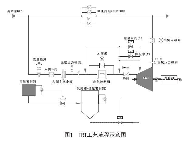 XX炼铁厂2#高炉TRT工艺流程为高炉煤气经过除尘装置后,经入口阀,进入25MW汽轮机,然后经出口阀到煤气管网,在入口阀之前,透平出口之后并联着旁通快开阀组,旁通阀(比例阀)组在正常升速启动、升降负荷、停机和紧急停机时,协调进行高炉顶压控制。