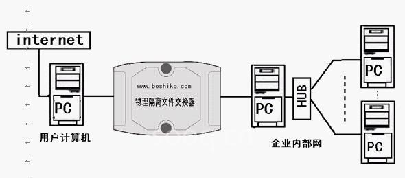 波仕的物理隔离文件交换器是一种内部带存储器、外部带2个USB口的设备,利用软件或者硬件的方法将内部存储器通过“网络闸门”分别切换接到进行文件交换的两台计算机的USB口上。在不同的时刻物理隔离器的内部存储器分别与其中一台计算机进行文件交换,然后内部存储器切换到与另外一台计算机进行文件交换,这样间接实现两台计算机之间的文件交换。这样的文件交换由于在任何时刻,两台计算机都没有直接相连,也就是物理隔离的。波仕的物理隔离文件交换器也可以用于任何两台计算机之间进行安全的文件交换。物理隔离隔离了全部七层网络层,是彻底的隔离。本产品已经获得发明专利,专利号:200920086911,侵权必究。