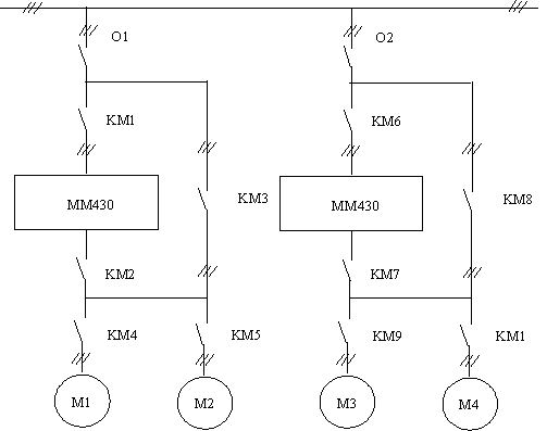 Q1控制的变频器为冷水供水系统,Q2控制的变频器为热水供水系统,系统为1拖1的恒压供水,两台电机为互备,可选择使用1#泵或2#泵运行,KM3、 KM8为手动工频运行选择,作为变频的维修系统备用,KM2 ,KM3、 KM7,KM8为机械互锁的接触器,保证选择变频运行和工频运行的正确切换。