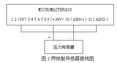 由于压力传感器是两线传感器在接线必须采用正确的接线方式,将变频器的+24V控制电源连接到传感器的+端, 传感器的-连接到PID的+输入,同时还必须将PID的-端连接到变频器控制电源的0V端。具体接线图如图2