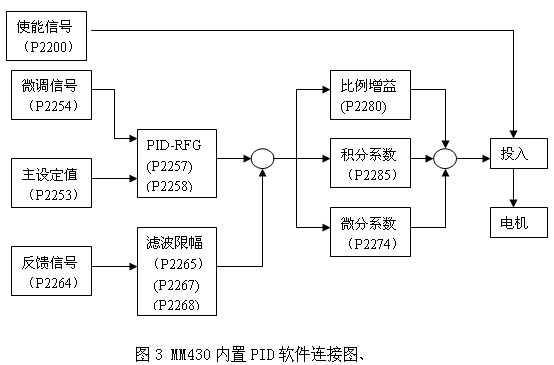 西门子MICROMASTER430变频器的内置PID功能,利用装在水泵附近的主出水管上的压力传感器,感受到的压力转化为4-20mA电信号作为反馈信号。根据宾馆的层高设定压力值作为给定值,变频器内置调节器作为压力调节器,调节器将来自压力传感器的压力反馈信号与出口压力给定值比较运算,其结果作为频率指令输送给变频器,调节水泵的转速使出口压保持一定。即当用水量增加,水压降低时,调节器使变频器输出频率增加,电机拖动水泵加速,水压增大;反之,当用水量减少,水压上升,调节器使变频器输出频率减少,电机拖动水泵减速,水压减小。