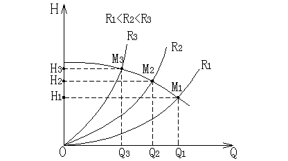 将风机的挡风板再关小,管网特性曲线变为R3,工况点移至M3,风量、压力变为Q3、H3,其输出流量是Q3。
