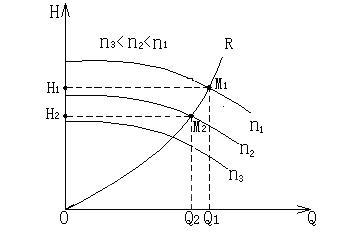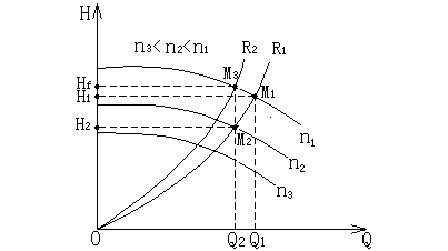 当风机转速为n1时,风机的风压-风量曲线与管网特性曲线R相交于M1点,其风量、风压分别为Q1、H1。