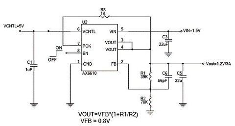 AX6610-6615应用上提供高抗噪声功能(PSRR高达-65dB)及稳定的工作电压,输出电压的瞬态响应快,而且提供Power-OK输出功能,方便提供电源监测,输出电容可适用于固态电容(铝/钽)及陶瓷电容(MLCC),其内部具有完整的系统保护功能包括软启动、低电压锁定(UVLO)、短路保护(SCP)、过温度保护(OTP)及过电流保护(OCP)功能而不需使用外部多余组件即可做到上述功能而且使电路设计达到极小化的要求。