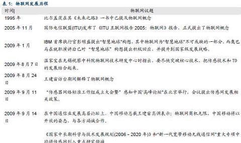 实际上,物联网概念起源于比尔盖茨1995年《未来之路》一书,在《未来之路》中,比尔盖茨已经提及物联网概念,只是当时受限于无线网络、硬件及传感设备的发展,并未引起重视。随着技术不断进步,国际电信联盟于2005年正式提出物联网概念,而今年奥巴马就职演讲后对IBM提出的"智慧地球"积极响应后,物联网再次引起广泛关注。而我国官方近期对传感网(物联网的另一称谓)的多次提议表示我国物联网的发展也正是提上议事日程,同时也表明我国物联网的发展将加快。目前,我国传感网标准体系已形成初步框架,向国际标准化组织提交的多项标准提案被采纳。