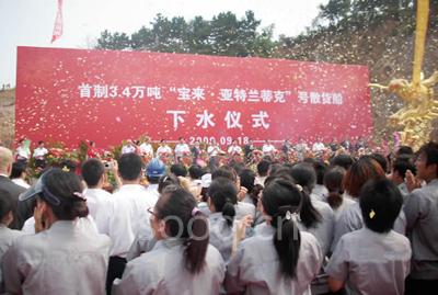 乘风破浪当此时,直挂云帆济沧海。鞭炮阵阵,欢呼声声,在众人的注目下,总长180米,型宽30米,型深14.70米,自重9740吨,载货量34000吨,航速达14节的“宝来·亚特兰蒂克”号开始徐徐下水。