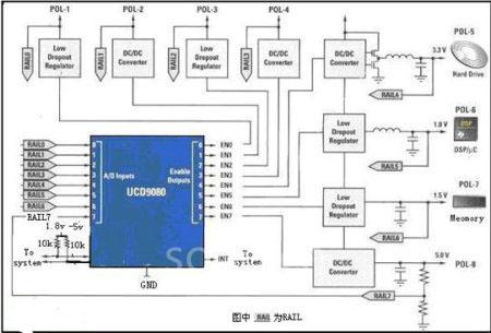 以UCD9080为例进行分析。单个UCD9080电源供电定序器可控制多达8组电压轨(见图3所示的Rail 0-7)及3个独立数字I/O口的电源次序。该器件无需外置存储器,采用单个3.3V电源支持运作。UCD9080采用20kHz的采样率及3.5mV分辨率对所有的电压轨进行监控,拥有强大的可配置能力,可实现对电源轨通电及断电的定序。UCD9080还包括了其他选项,例如错误状态下(如电源轨失效)的再定序。电源轨再定序可基于定时事件或基于与定时事件相关联的其他电源轨,以实现调节。并且,每条电源轨都可实现对毛刺脉冲(gtitch)、低压及过压限侵害的监测。所监测的每条电源轨还可通过配置窗口设定以实现对其他电源轨的关断。图3为电源供电定序器UCD9080功能引脚示意图。