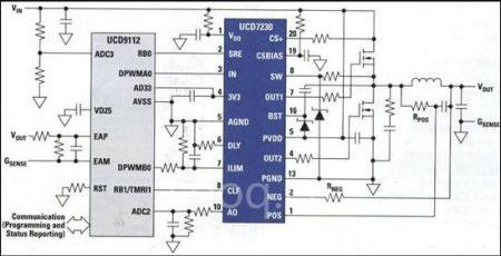图7为应用UCD7230数宇控制同步压降与数字脉宽调制控制器UCD9112相接构成数字转换器示意框图。它反映了新型数字脉宽调制控制器UCD9112需要具备智能型集成MOSFET驱动器的UCD7230支持。
