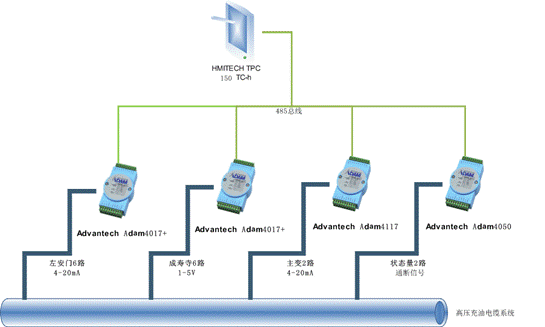 用模拟量采集模块ADAM4017+采集14路高压充油电缆的油压,由ADAM4050采集2路开关量信号,通过RS485和TPC150TC-h连接,把采集的模拟量和数字量显示到TPC中,由上位机的组态软件HMIBuilder处理之后将信息通过局域网发给中心主检测计算机。数据上传是采用modbusTCP转发,在中心主计算机上可以实现检测的功能。