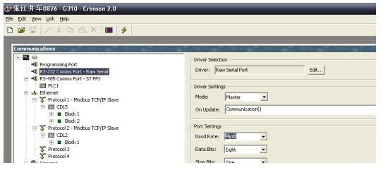 1. 红狮G310C HMI通过 RS-232连接卡特的发电机,由于卡特的发电机有的机型采用了客制化的专用协议M5X。由于红狮的HMI支持自由协议的编程,所以可以同样很方便的与这些客制化的私有协议通信。