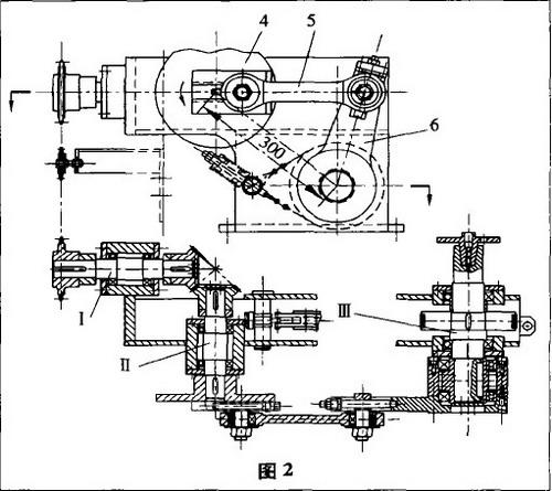 改造后的传动结构装配图如图2所示。动力由冲床曲轴通过滚子链、一对锥齿轮和一套四连杆机构传过来,滚子链由张紧轮张紧,离合器在Ⅲ轴上,同制动轮、制动带配合实现Ⅲ轴的间歇运动。工件分度的角度调整范围由四连杆机构控制,角度变化时由调节四连杆中的4、6杆的长度来实现。杆4用来粗调,杆6 用来精调,角度变化从刻度盘上可以看到。