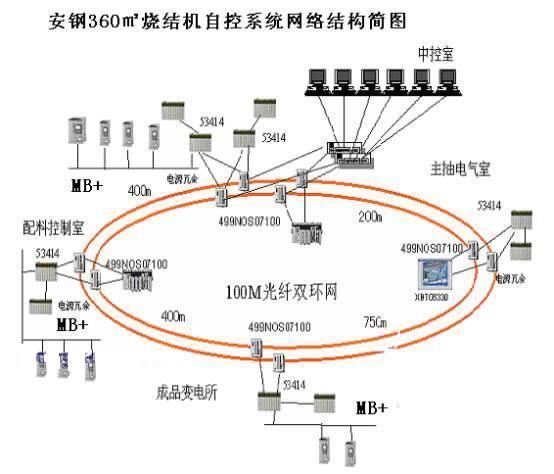 自动控制系统实现对整个烧结机生产设备的联锁控制,实时数据的采集与分析,过程与设备状态的监控与报警,过程趋势数据的采集与处理,报表打印,画面显示。完成了生产设备的基础自动化及过程计算机控制。各个PLC站、上位监控机、工程师站之间采用双环路光纤配置的TCP/IP工业以太网连接,构成了烧结生产的综合监控网络。