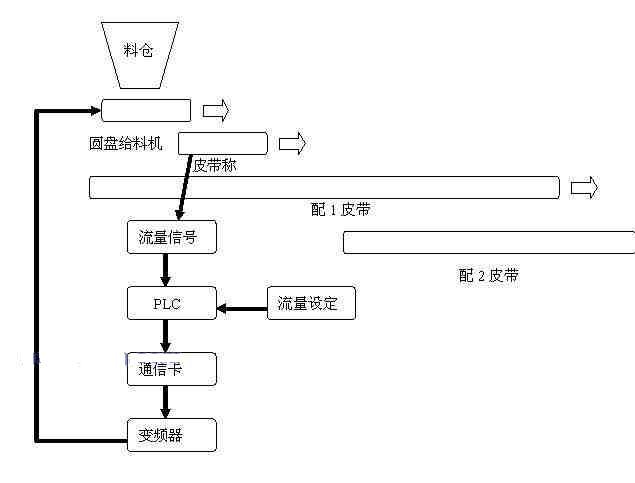 在圆盘配料系统中,给料量主要由圆盘的转速决定,并且与圆盘的转速成线性比例关系。处于机旁手动操作方式时,操作工可手动调节操作箱上电位器来控制变频器频率,从而控制圆盘给料机的转速。处于自动运行方式时,中控室操作工可从上位监控机设定流量给PLC,同时电子皮带秤测出一个实际流量信号反馈回PLC参加PID运算,最后,得到一控制量,通过MB+网控制变频器,从而控制圆盘给料机的转速。达到控制物料流量的目的。配1、配2、混1等皮带机自动控制程序上做了严格的连锁控制,避免了下游设备故障停机引起上游皮带堆料问题。