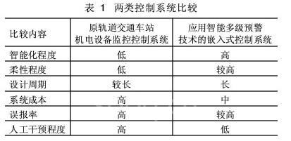 报,即通过设备状态的信息获取、特征提取及在线分析,实现设备故障的多层次预报,在监控历史数据库基础上,构造监控及运营管理专家系统,从而提高运营管理水平,减少工作人员的人工维护,减少设备故障率,提高设备的运营效率,改善车站人员的工作环境,降低运营成本。在尽量不改变或少改变现有设备的基础上,通过局部的嵌入式技术应用,实现对轨道交通车站监控设备的智能化改造;对既有不同设备进行信息整合,通过信息和智能技术,提升设备监控系统的性能。基于现代交通对技术发展的需求,综合考虑设计周期、系统成本、可靠性、体积、功耗、系统智能化程度等多方面因素,将基于嵌入式技术的智能多级预警控制器用于轨道交通,在区域控制器中有很大优势。可以预见,该类系统将成为未来几年城市轨道交通车站机电设备监控的发展方向。