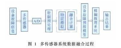 轨道交通中的机电设备众多,且发生故障的表象特征也各有不同,为实现故障的准确预警,应利用多种传感器不同特点、使用范围和精度,获得各种机电设备的局部情况和数据。通过多传感器之间的协调和性能互补,克服单个传感器的不确定性和局限性,通过运算分析,可以获得对被测对象的一致性解释与描述[1]。数据融合技术涉及信号处理、特征提取、推理决策三大环节,本研究所采用的多传感器系统数据融合同样也由这三大部分组成,其过程如图1所示。由于被测对象多为具有不同特征的非电量,所以首先将它们通过传感器转换成为电信号,经过A/D转换将现场参数变为可由微处理器处理的数字量[2]。数字化后的电信号经过预处理,可以滤除数据采集过程中现场环境下的干扰和噪声;对处理后的目标信号做特征提取,根据所提取的特征信号进行数据融合,最终输出结果。