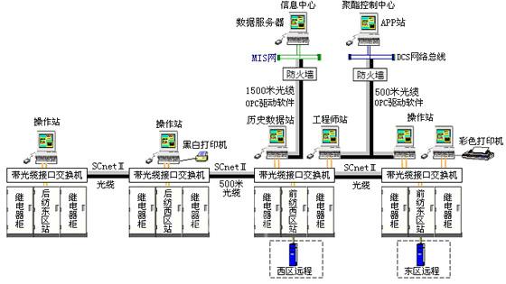 本改造项目的WebField ECS-100控制系统由四个操作站、一个工程师站、一个历史数据站、四个控制站、八个继电器柜和一套过程控制网络组成,前纺西区控制中心与聚酯中心TDC-3000控制系统采用OPC方式进行双向数据通讯,同时将ECS-100 控制系统信息网与厂用MIS网通过防火墙进行数据传送,达到了实时监视与管理的目的,各个控制点采用光缆连接。本项目控制系统配置图如图2所示。