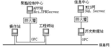 由于工艺操作和控制的需要,聚酯控制中心Honeywell TDC-3000控制系统与前纺控制中心ECS-100控制系统双方各有部分关键数据需要参与操作和控制,双方通过厂里的信息管理网连接,采用OPC方式实现双向数据通讯, ECS-100控制系统两台操作站作为OPC客户端与TDC- 3000控制系统的OPC服务器连接,实时刷新周期设置为2秒,采用病毒防火墙以防止病毒入侵。