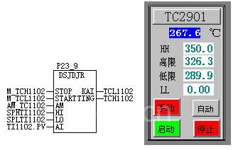 专用逻辑控制模块:前纺的增压泵加热、过滤器加热、组件预热炉加热、后纺叠丝机电加热的温度控制要求是相同的,即温度降至低报值时则开始加热升温、温度升温至高报值时则停止加热;高报与低报不参与报警,高高报则需要报警提示;两种操作方式:手动/自动操作;温度控制采用两个开关量输出(升温-常开触点、降温-常闭触点)连接至电气回路进行控制。