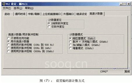 3.调试旋转编码器时,A、B、Z相按说明书接线,在PLC编程软件中对编码器的高速计数进行设置,使用Z相加软件复位方法。见图(7)。按下按钮5SA,使传送带电机停车时,四连杆装箱包装机应停止工作。